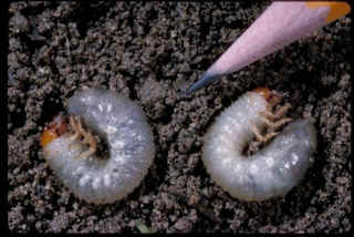 The larval stage of many different beetles, including the Japanese beetle. The grub lives below ground and feeds on the roots of tender grass plants that soon kills the plant. They are most destructive mid-late summer, but the damage they cause may not show up until early fall and by then, it's too late. The best time to control grubs is in early summer, just after they hatch. At this time they are very susceptible to treatment and just before they start causing extensive damage to your lawn.
