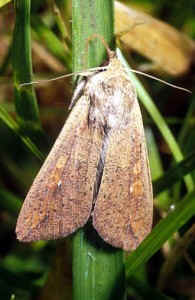 If lots of sod webworm moths are observed in the evening, watch for damage in about 10 - 14 days. This is when their eggs begin to hatch into caterpillars. These caterpillars chew off the grass blades close to the soil surface leaving brown stubble as damage. Early August is typically when we see the heaviest damage, although sometimes damage is also heavy in June. Insecticides should be applied to the surface of damaged areas.